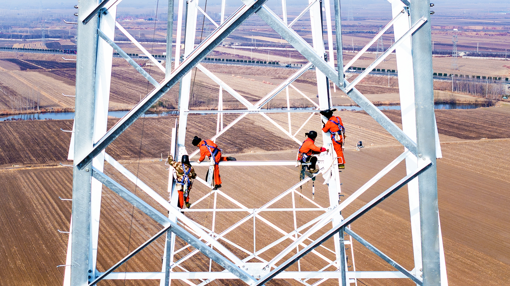 1月1日,國(guó)網(wǎng)山西送變電公司施工人員堅(jiān)守施工現(xiàn)場(chǎng),在500千伏忻州北-陽泉線路工程開展落地雙搖臂抱桿組塔作業(yè)。